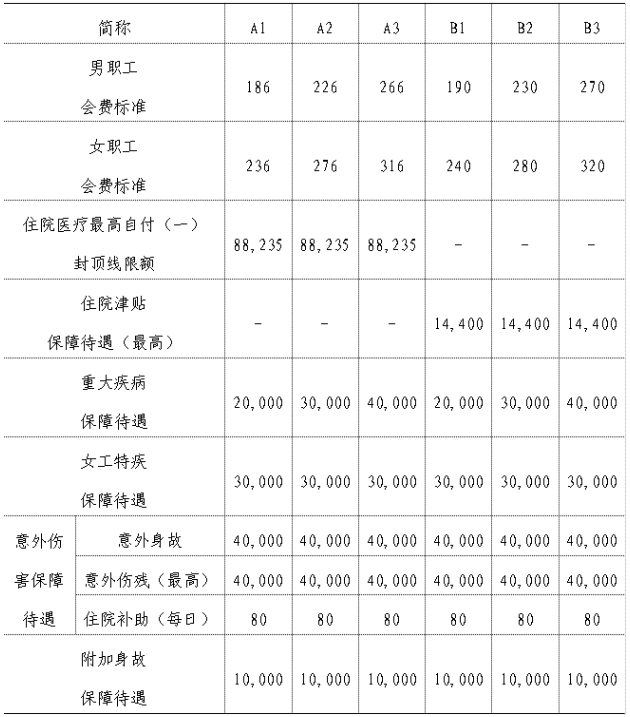 在一个互助保障责任期内,《在职职工住院医疗互助保障活动》自付(一)最高封顶线限额为88,235元;《在职职工重大疾病互助保障活动》按照不同会费档次领取20,000元、30,000元、40,000元;《在职女职工特殊疾病互助保障活动》领取30,000元;《在职职工意外伤害互助保障活动》最高领取54,400元;《在职职工附加身故互助保障活动》领取10,000元。